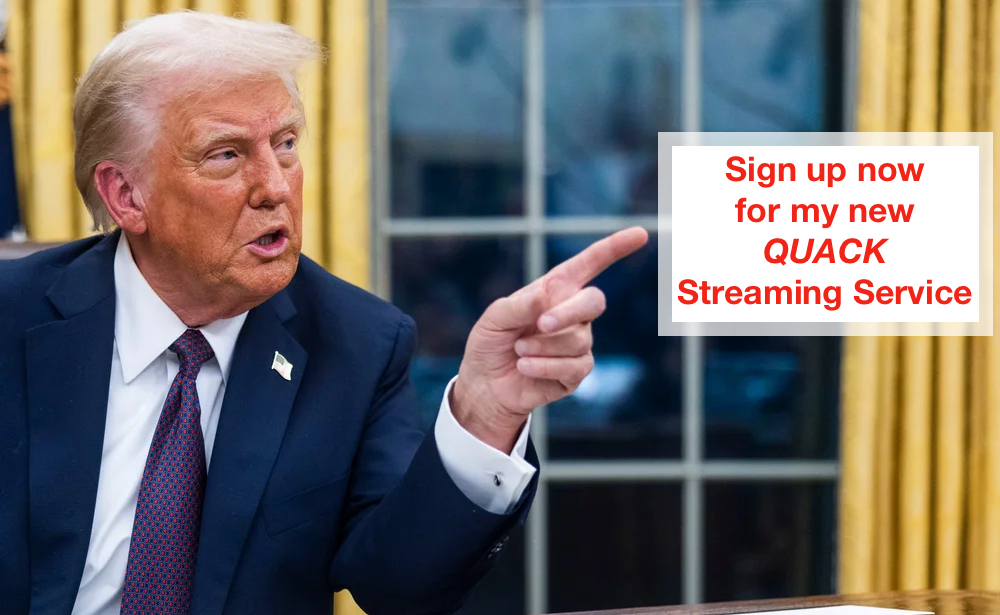 Annual Quack subscriptions, fully tax deductible, are now available at a pre-launch price of $59.95. Order before your last Independence Day, 7/4/2025, and receive a Trump poster depicting the President signing an executive order defunding PBS. Sign up for Quack now. Posters are limited.