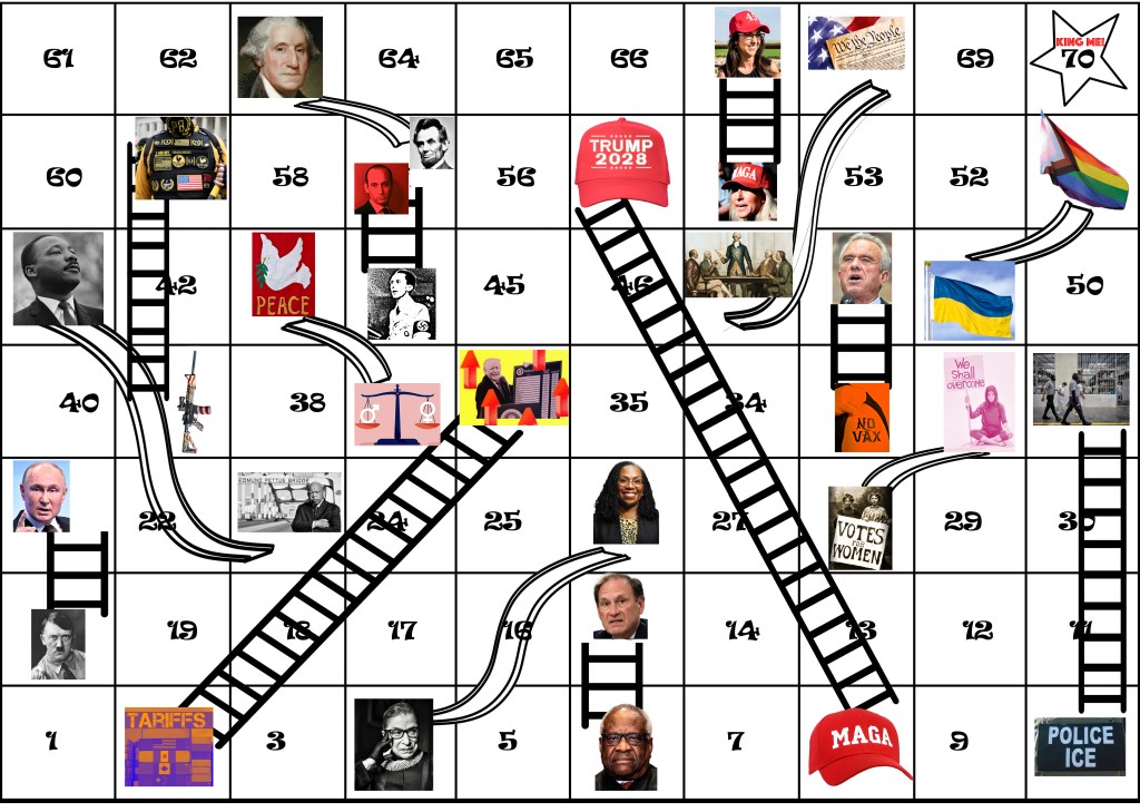 Mar-a-Lago Inc. is proud to announce the distribution of Chutes and Ladders, the MAGA Edition (CALME). You can get the true dictatorial feeling by playing like Anything Goes Donald Trump. Send illegals packing. Impose tariffs on any import. Prosecute your enemies. There are no nice guys when you roll the dice.