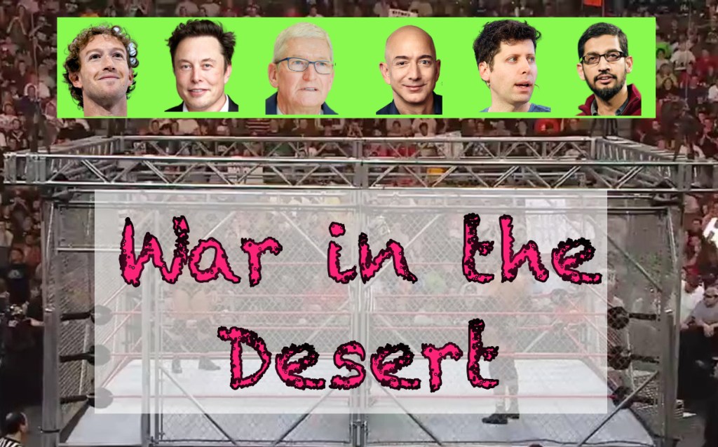 Mar-a-Lago Enterprises and the WWE announce a special pay-per-view event, “The War in the Desert,” to take place on September 1, 2025, at Las Vegas’s T-Mobile Arena. This once-in-a-lifetime extravaganza will feature your favorite Tech Bros in a no-hold-barred cage match with special referee J.D. Vance. Among the participants confirmed at press time are: