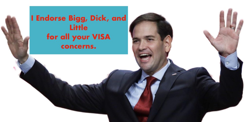 Bigg, Dick, and Little, a division of Mar-a-Lago Enterprises is proud to offer assistance to US Visa seekers with a new program called “We’re not James, but We’ll Bond It for You.” If you’re coming to America and are a little short of the $15,000 required to secure passage to the States, call us now at 1-800-BIG-SCAM. Our representatives will be glad to answer all your questions and sign you up for one of our premier visa packages. Do you own a car? You qualify. Do you own property? You qualify. Do you have kids? You qualify.