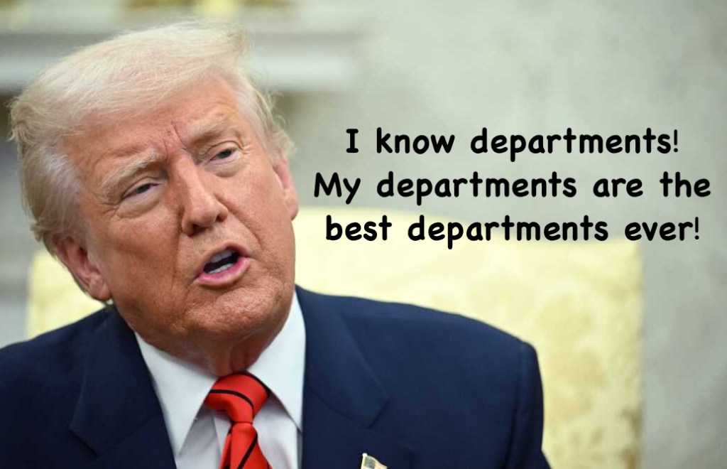 From this day forward, backward, upward, or downward, let it be know throughout the world and universe that I, the honorable Donald J. Trump, your supreme commander and best President ever to have graced the new gold-plated, bordello-style oval office, am declaring the renaming of the following United States departments effective immediately, or when I get off the golf course.