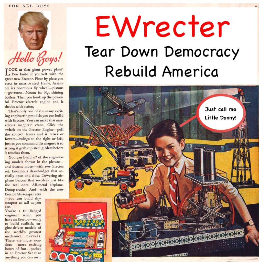Mar-a-Lago Enterprises announces the release of the Trump Ewrector Set in time for Christmas. Kids of all ages and adults with dreams of granduer who want to raze hell, will be thrilled to find this package under their “we-saved-Christmas-but-it-cost-you-more-tree.” For a mere $249.95, you’ll get a set of pre-constructed Washington, DC buildings, including the White House, the Capitol Building, the Supreme Court building, and the National Museum of African American History. Put on your working gloves (included in the set) and help your kids tear ‘em down while National Guardsmen toy soldiers (included in the set) surround the excavation sites to keep out protestors (not included in the set).